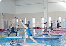 SUP(スタンド・アップ・パドルボード)ヨガとは、水面に浮かべたボードの上で行うヨガです。定期的な開催は岐阜県内の屋内プールでは初となるSUPヨガ。通常のヨガに比べ、一度により多くの体幹の筋肉を使用し、代謝を促進できることです。